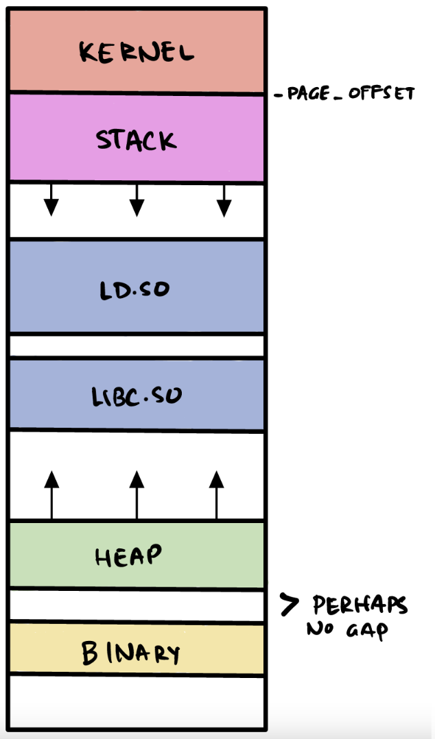 codeanddatasections (more on these later) contain only instructions and data from the source code file(s) - ASLR security: ASLR stands for Address Space Layout Randomization. We will talk about this more in depth later, but essentially every shared library required to fulfill the imported functionality exists at a unique, random address in memory. The stack is also randomized to a different address range every execution. This means an attacker has to go through much more work to locate potentially necessary code for an exploit (boo!)